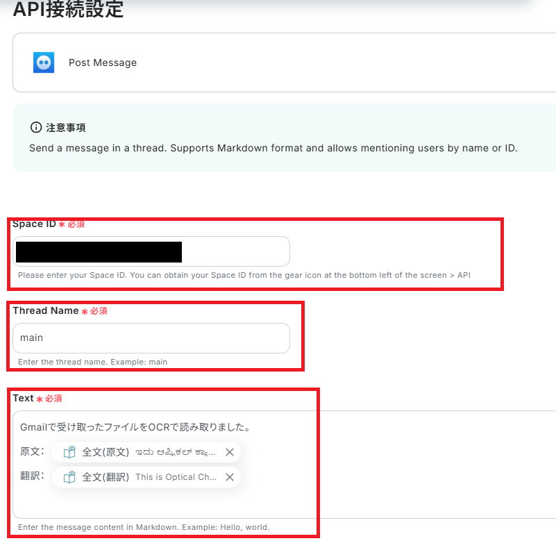 Space ID、Thread Nameを注釈に倣ってそれぞれ入力していきます。 Textは通知される際表示される文章ですので、例に倣い、わかりやすく書いてみてください。