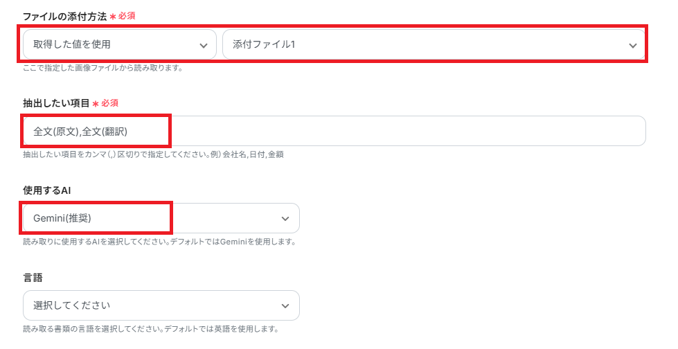AI読み取りの詳細設定ですが、今回は下記のように設定しました。