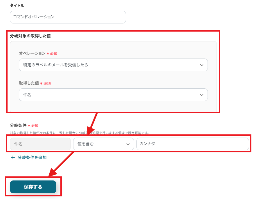 「タイトル」「分岐対象の取得した値」はそのままで、「分岐条件」が、「件名・値を含む・カンナダ」になっているか確認してください。 各設定は、利用状況にあわせて変更可能です。 問題なければ保存するをクリックします。