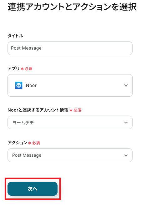 連携アカウントとアクションを確認していきます。 タイトルはわかりやすいものに変更してもOKです。 アカウント情報は、マイアプリ連携したアカウントが選択されているか確認してください。 アクションはデフォルト設定のまま、「次へ」を押して進みましょう。