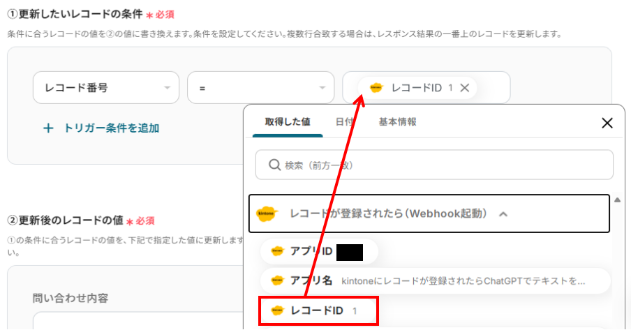 3.ここでは、具体的に更新するkintoneアプリの設定を行います。 まず、「更新したいレコードの条件」には、ステップ4と同じようにレコードIDを選択しましょう。