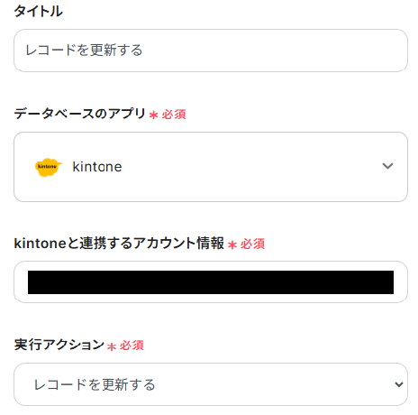 2.画面が遷移するので、操作するkintoneアプリについて設定しましょう! 今回はステップ3で使用したkintoneアプリのレコードを更新するような設定をしたいと思います。 まずは、下記の画面になるのでタイトルやアクションを設定しましょう。 ステップ3や4と同様に、修正・確認をしてください。