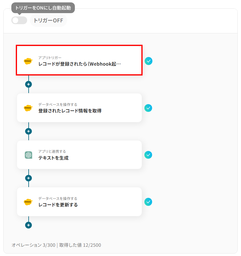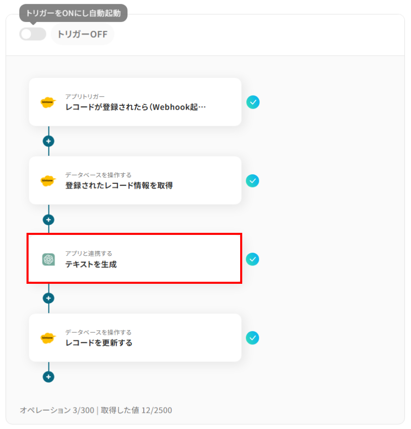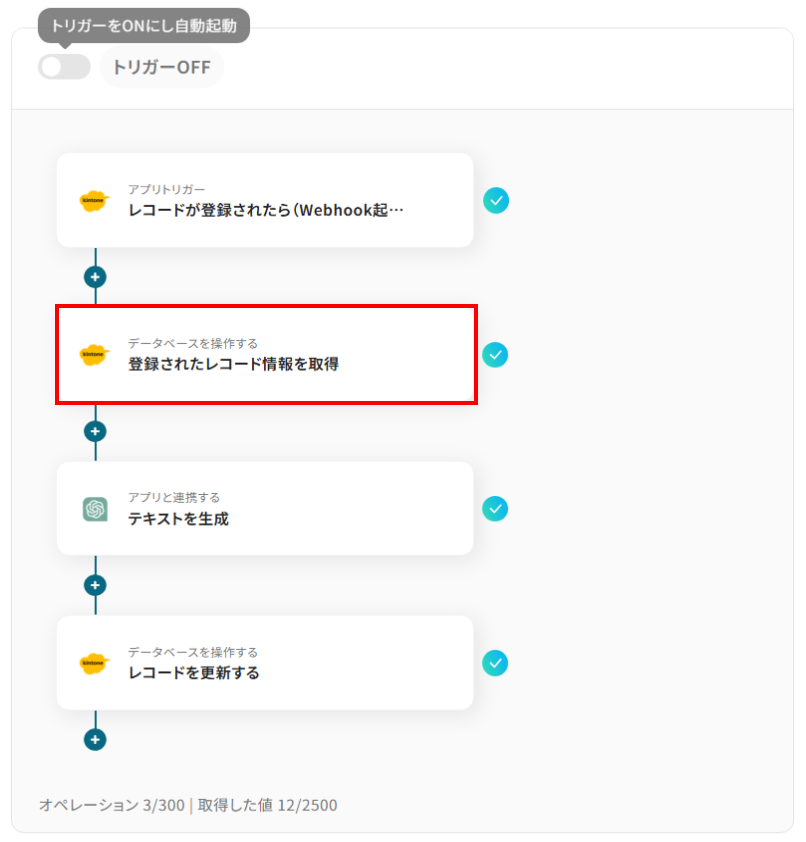 kintoneに新規レコードが登録されたら、ChatGPTでテキストを生成して、作成されたテキストをkintoneのデータベースに格納するフローです。