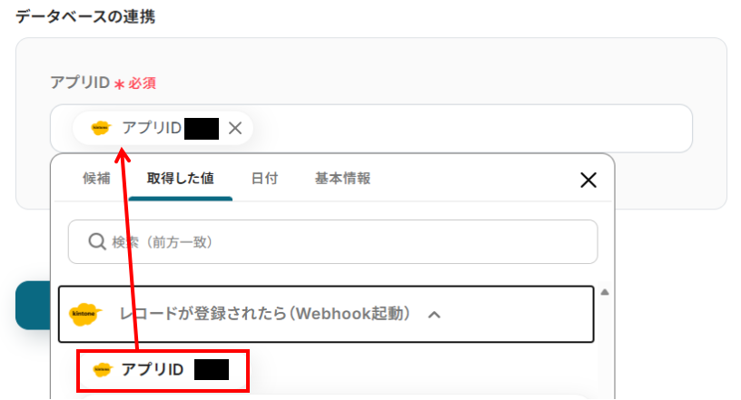 ページをスクロールし、データベースの連携欄を入力欄下の注意事項を参考に入力してください。 入力欄をクリックすると下記のようにアプリIDを選びましょう。 設定が完了したら、「次へ」を押して進みましょう。