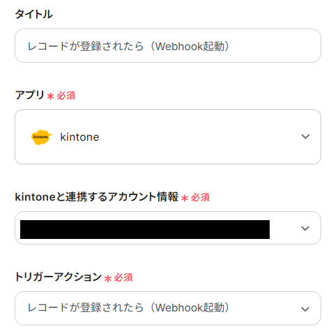 2.まずは、対象のkintoneアプリの設定をします。 タイトルとアカウント情報はステップ1で設定した内容が入力されています。なお、タイトルは任意でわかりやすい名前に変更可能です。 アクションは、テンプレート通りに「レコードが登録されたら(Webhook起動)」のままで大丈夫です。 設定が完了したら、「次へ」を押して進みましょう。