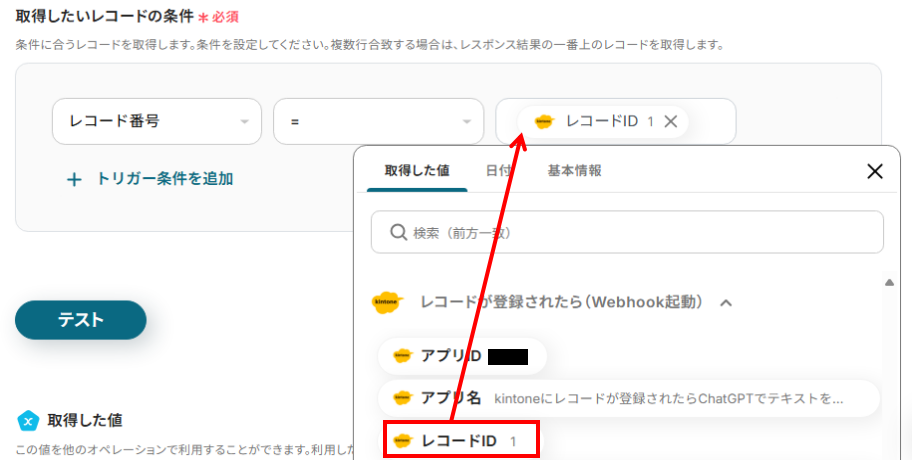 3.続いて、kintoneアプリからレコードの情報を取得する設定を行います。 今回は「レコード番号」と「レコードID」が合っているレコードを取得するようにしました。 条件を追加することも可能なので、活用する業務内容に合わせてカスタマイズしてみてくださいね!