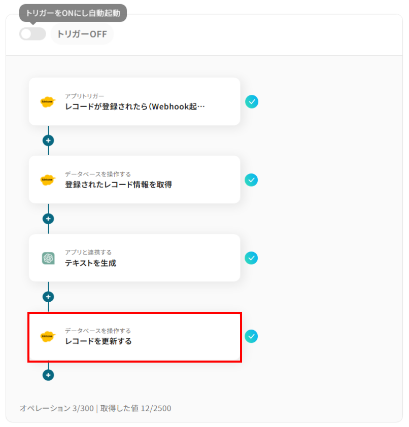 この連携は、kintoneのデータの中から特定の条件に合致するものだけを抽出し、ChatGPTで処理した上でkintoneにフィードバックするという、より高度な分岐処理を含む自動化パターンです。