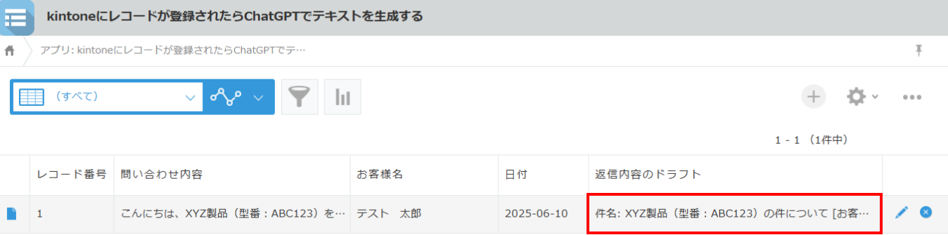 例えば、問い合わせ管理アプリに新しい問い合わせが登録されたら、その内容に基づいた返信メールのドラフトをChatGPTが作成する 、といった活用が可能です。