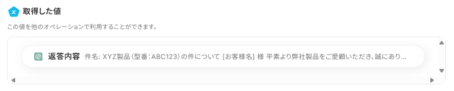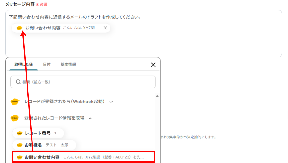 次に、更新後のレコードの値を設定していきます。 レコードを更新したい項目の入力欄をクリックすると、下記のようにアウトプットが表示されるので、お好みでカスタマイズしてください。 今回は、「返信内容のドラフト」項目にAIで生成した返答内容を反映するよう設定しました。