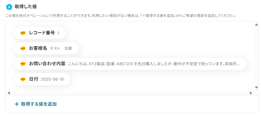 これにより、アンケートの自由記述欄やお問い合わせフォームの長文内容を、担当者が確認しやすいようにChatGPTが要点をまとめてkintoneに記録する ため、情報収集と整理の手間を大幅に削減します。