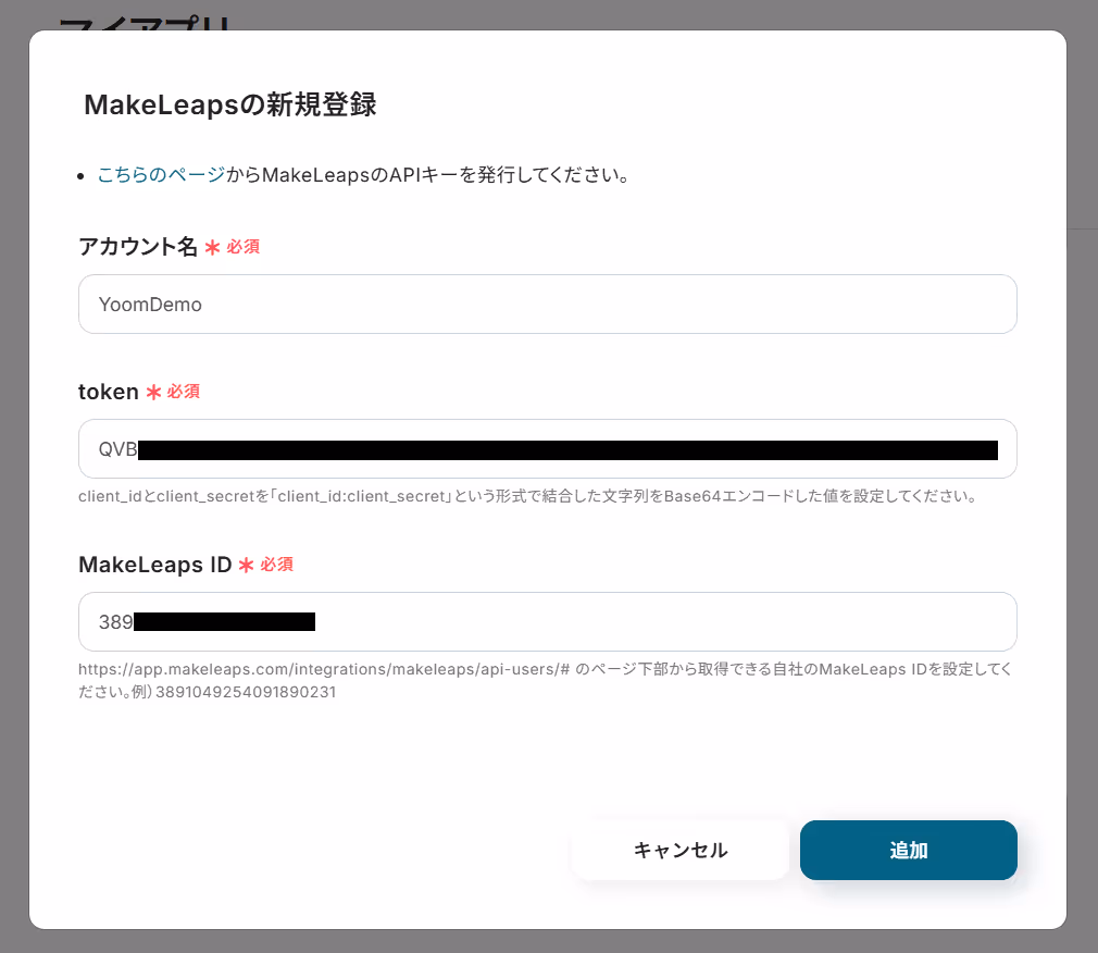 先ずは、Yoomと連携させたいkintoneアカウントとMakeLeapsアカウントを「マイアプリ」に登録しましょう。