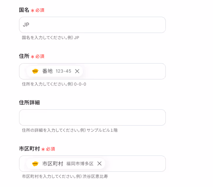 また、国名はJPなどの国名コード、都道府県はtokyoなどの小文字のローマ字で設定する必要があります。