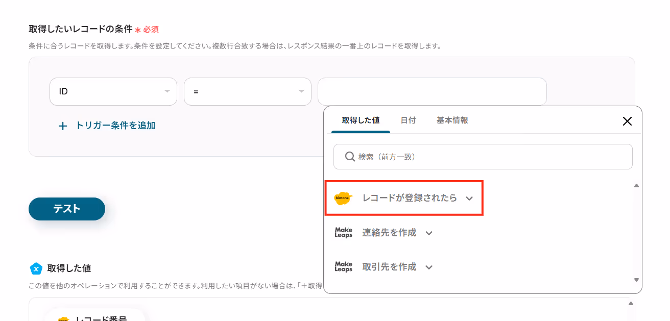 この記事では、先程ご紹介した「kintoneにレコードが登録されたら、MakeLeapsで取引先を作成する」フローを作成します。