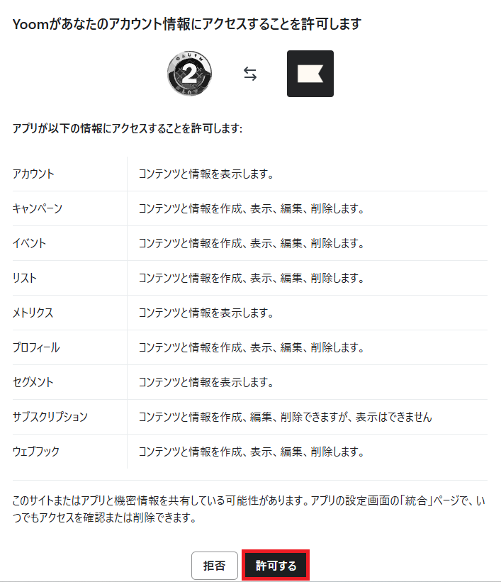 アクセス許可画面が表示されたら、内容を確認し、「許可する」または「Allow」を押してください。