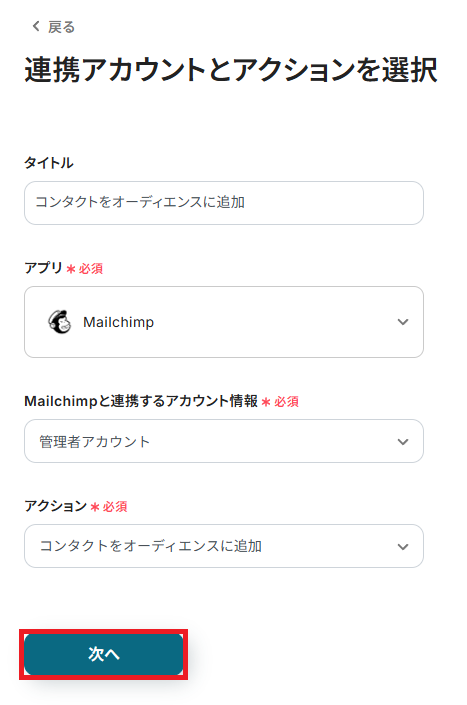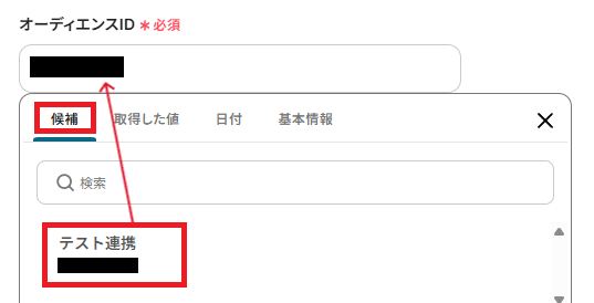 「オーディエンスID」には、候補に表示されるMailchimpのIDを選択してください。
