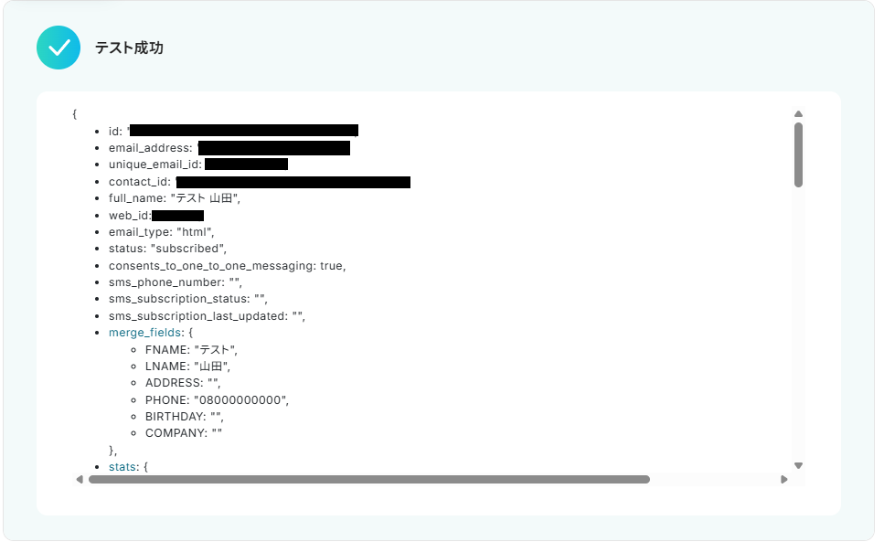後続のMailchimpのアクションを設定する際に、Klaviyoから取得した値を任意の項目に設定することで連携できます。