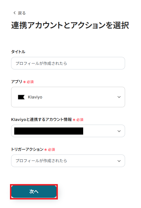 Klaviyoと連携するアカウントに間違いがないかを確認し、「次へ」をクリックしましょう。