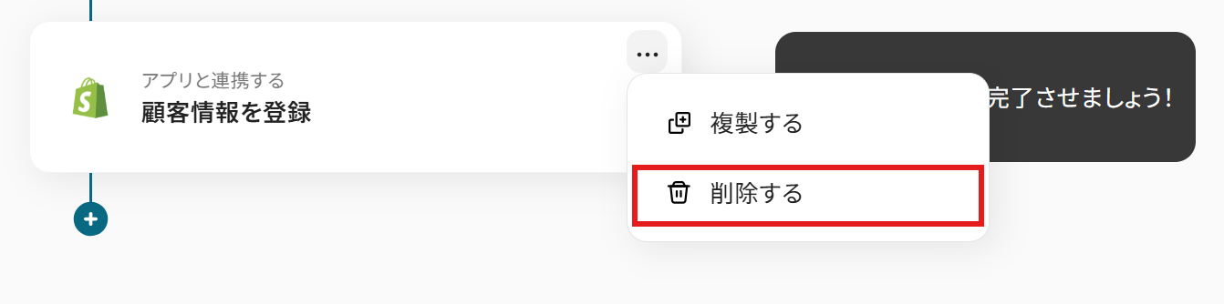 なお、Shopifyの方は「顧客情報を更新」のアクションがあるので、情報を更新したい場合はアイコンの右上にある三点リーダーをクリックし、既存のものを削除してから設定しましょう。