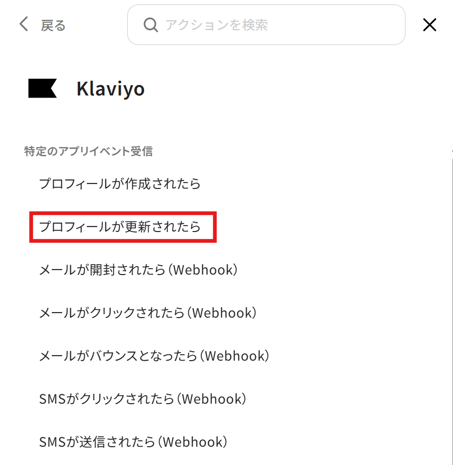 今回は「プロフィールの作成」がトリガーでしたが、Klaviyoのアクションには「プロフィールが更新されたら」があります。こちらに変更することで更新された際に起動するフローが作成できます。