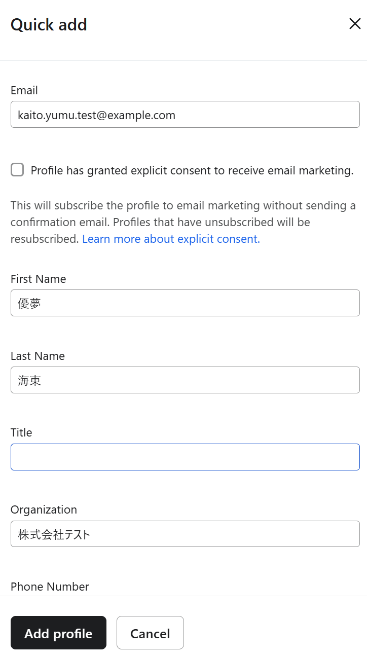 今回は必須項目と氏名のみ登録していますが、他にも電話番号や住所などの項目があります。