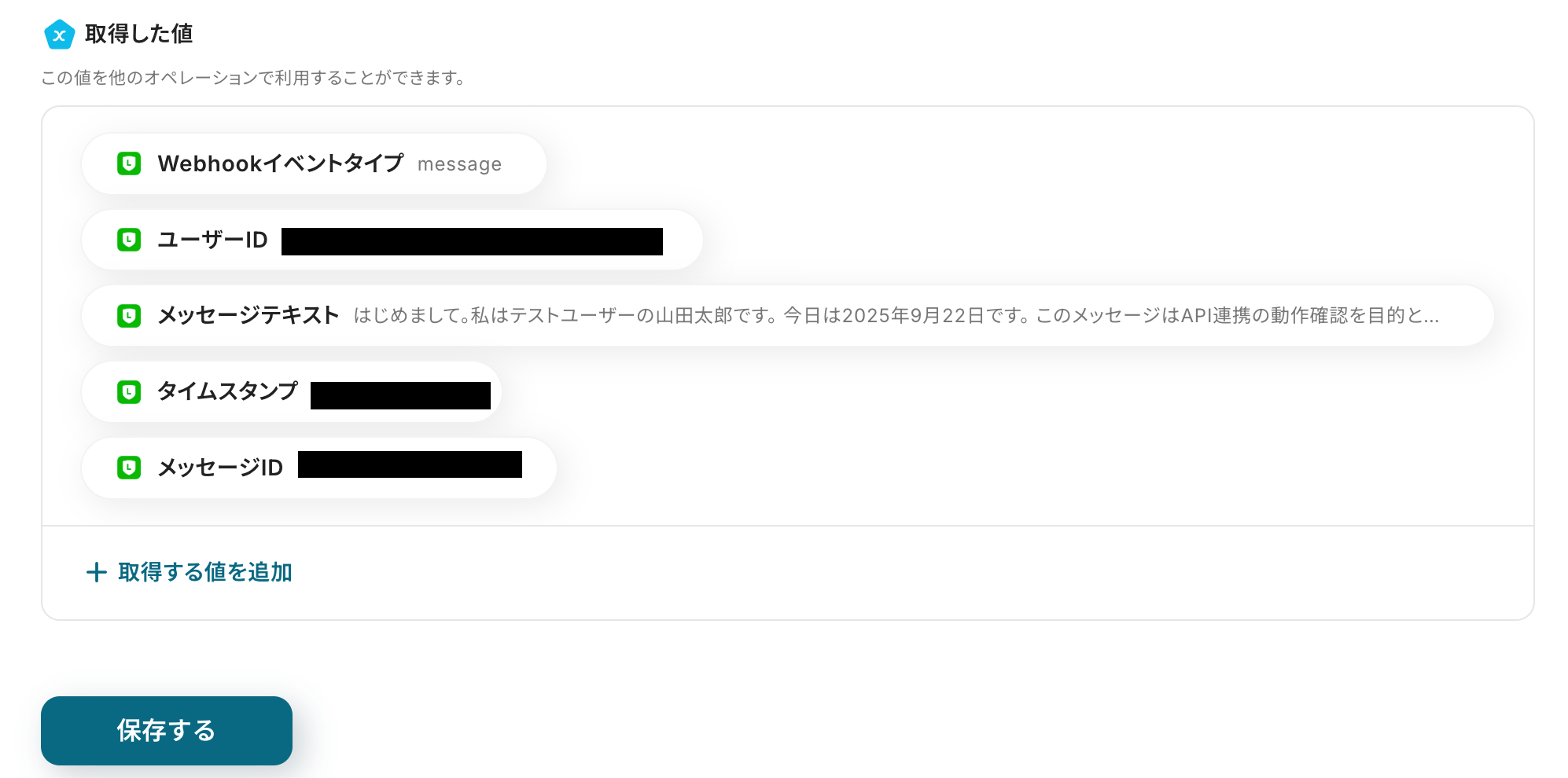 →テストをクリック 成功したら、取得した値にメッセージ内容が反映しているはずです。