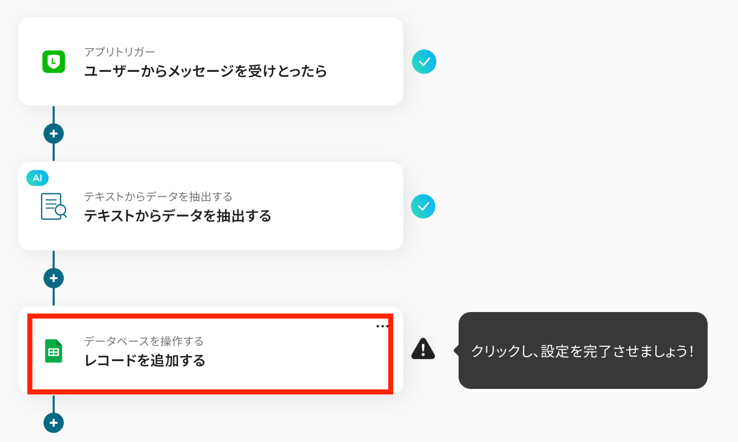 今回は「LINE公式アカウントでメッセージを受信したら、任意の項目をAIで抽出しGoogle スプレッドシートに追加する 」フローを作成していきます! 作成の流れは大きく分けて以下です。