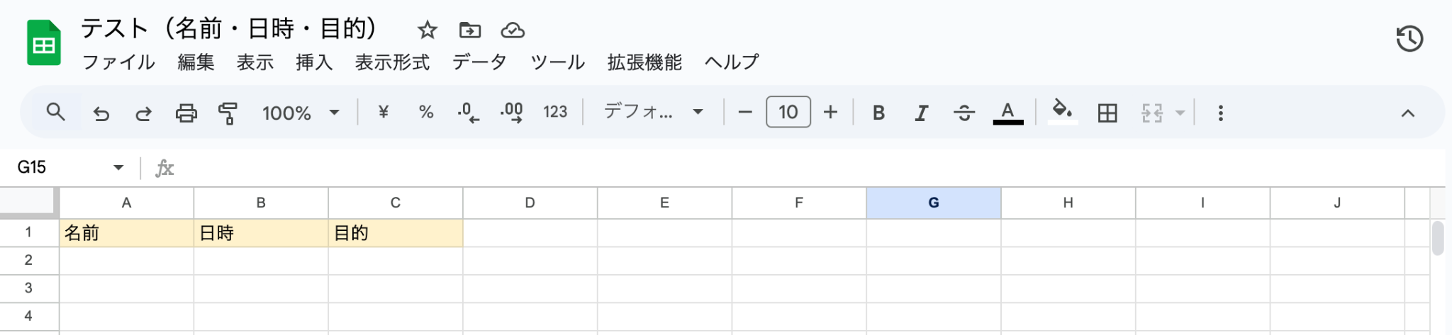 まずは、レコードを追加するGoogle スプレッドシートを用意してください。 今回は、下記のようなGoogle スプレッドシートを準備しました。