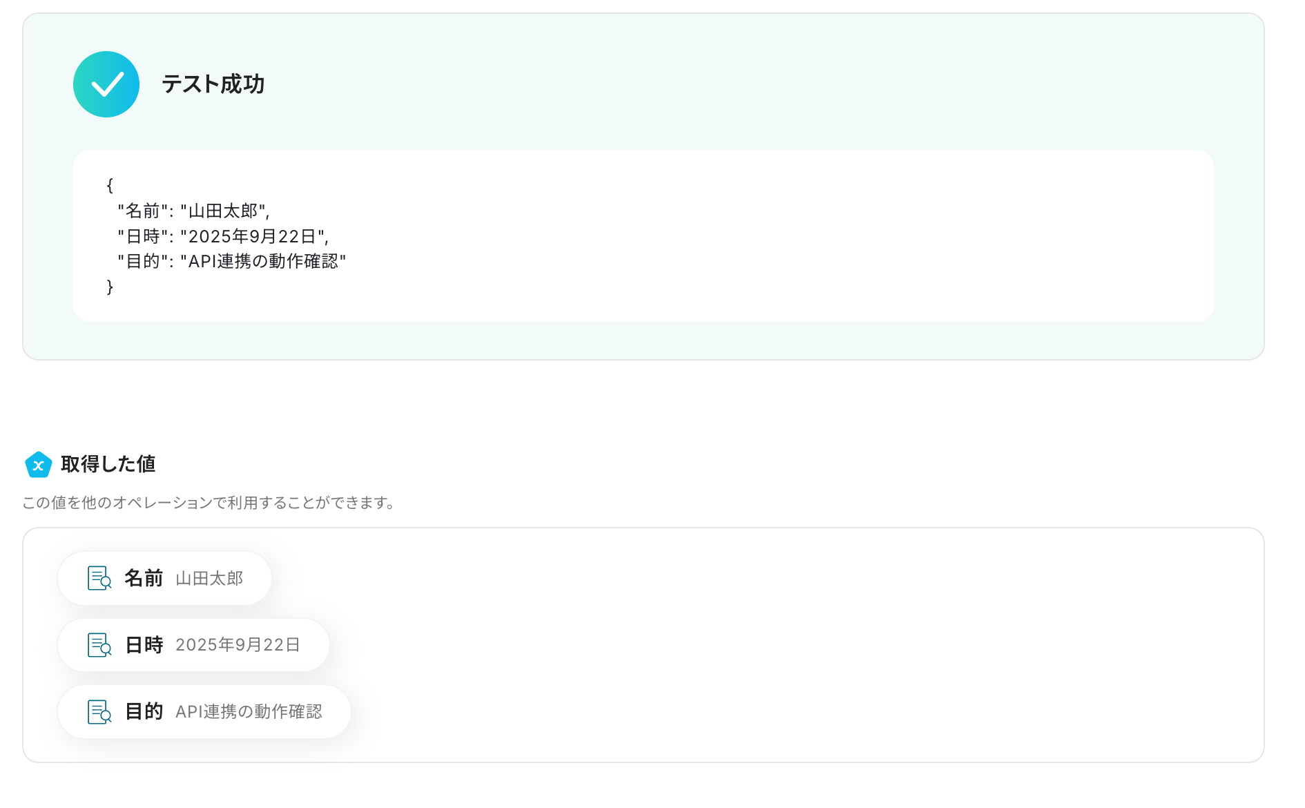 入力が完了したら、テストのボタンをクリックしてください。 テストが成功すると、以下のように取得した値が表示されます。 指定したデータが抽出されていればOKです! 最後に、「保存」を押して次のステップへ進みましょう。