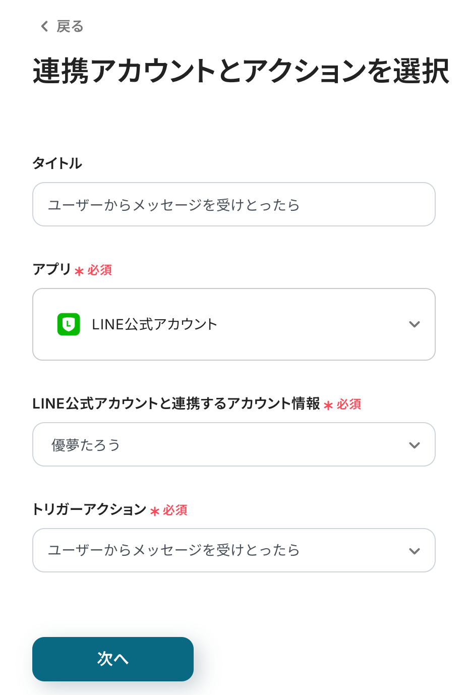 アプリトリガー 「ユーザーからメッセージを受けとったら」