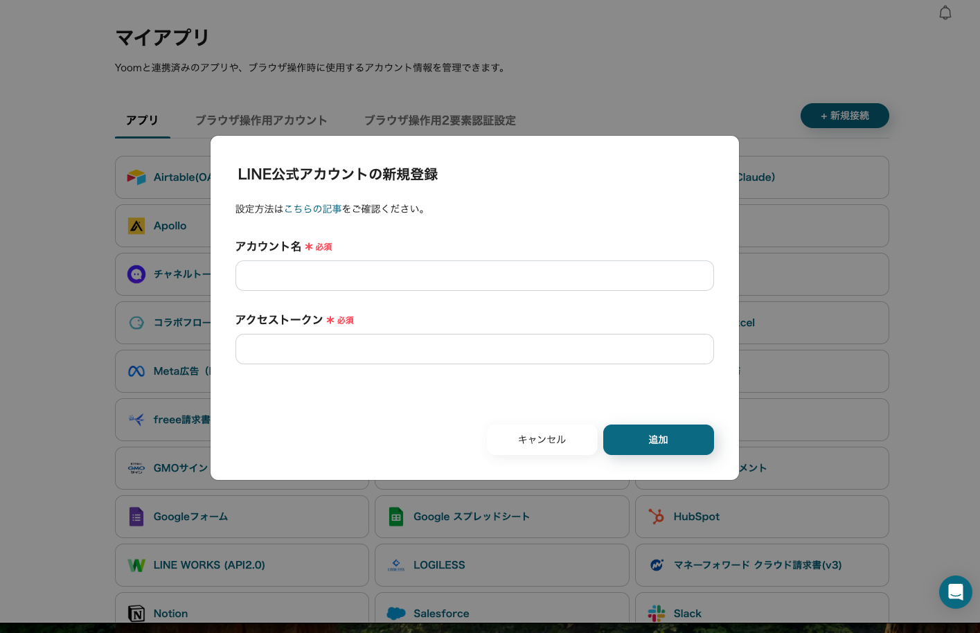 LINE公式アカウントのマイアプリ追加方法 を確認しながら、「アカウント名」と「アクセストークン」を入力してください。 その後、「追加」をクリックするとマイアプリ連携が完了します。