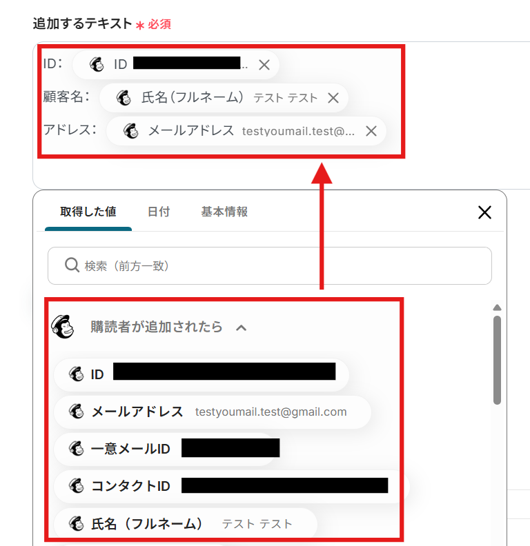 追加するテキストは、先ほどMailChimpから取得した値が表示されますので、必要な項目を選択しましょう。