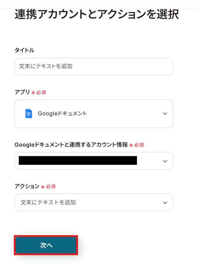 次に、先ほど取得した購読者の情報を、Googleドキュメントに追加するアクションの設定を進めていきましょう。