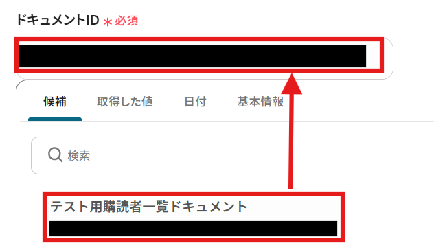 ドキュメントIDは入力欄をクリックすると表示される候補の中から、先ほど用意したドキュメントを選択します。