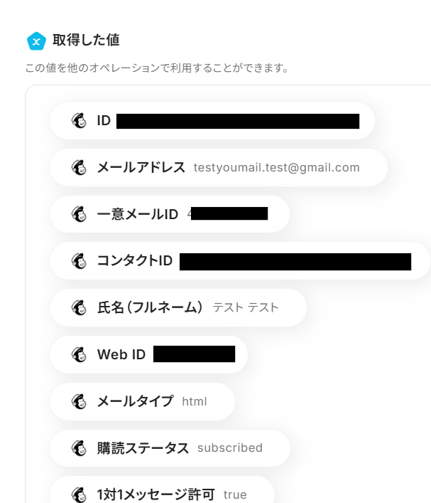 トリガー設定の際に、MailChimpから取得する値を追加することで、連携内容をカスタマイズできます。