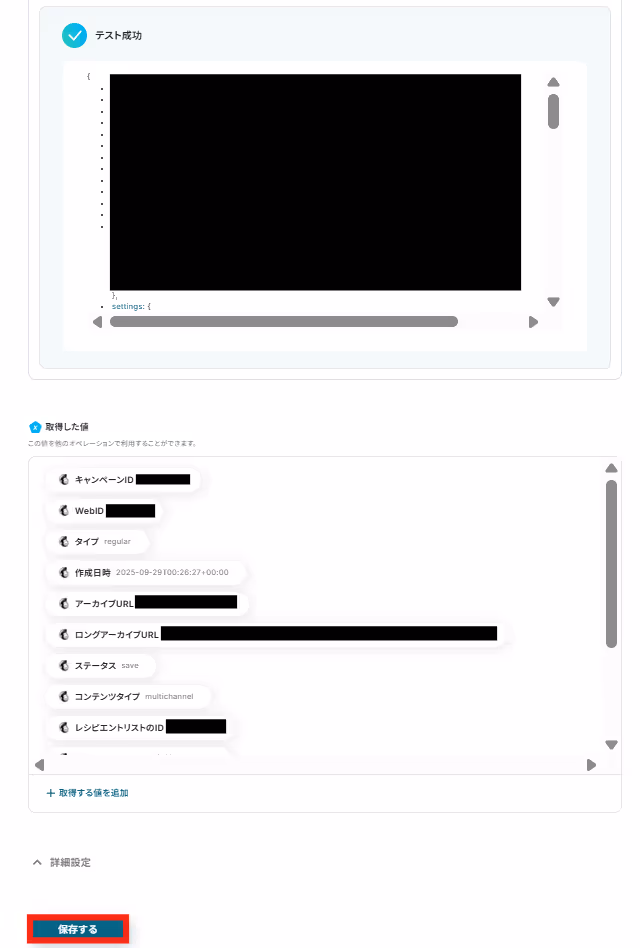 テストが成功したら、「取得した値」が表示されます。