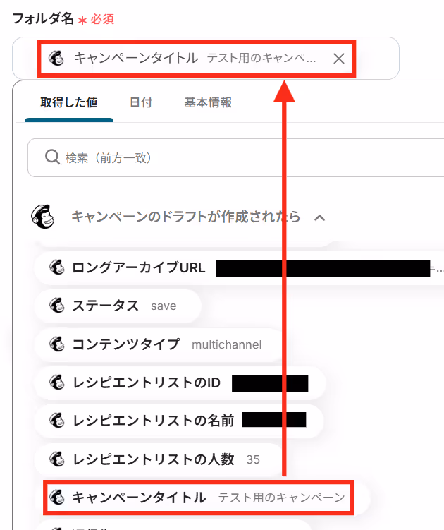 フォルダ名は、入力欄をクリックすると選択肢が表示されますので、取得した値の中から選びましょう。
