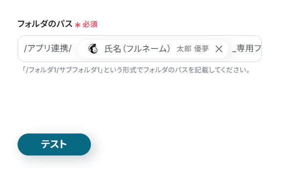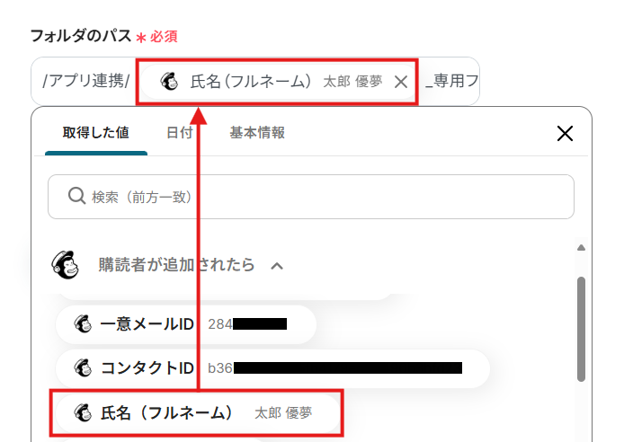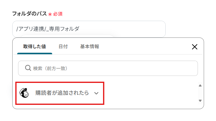 - Dropboxでフォルダを作成するアクションで、フォルダ名を任意に設定してください。Mailchimpから取得した購読者の氏名やメールアドレスなどを設定することも可能です。