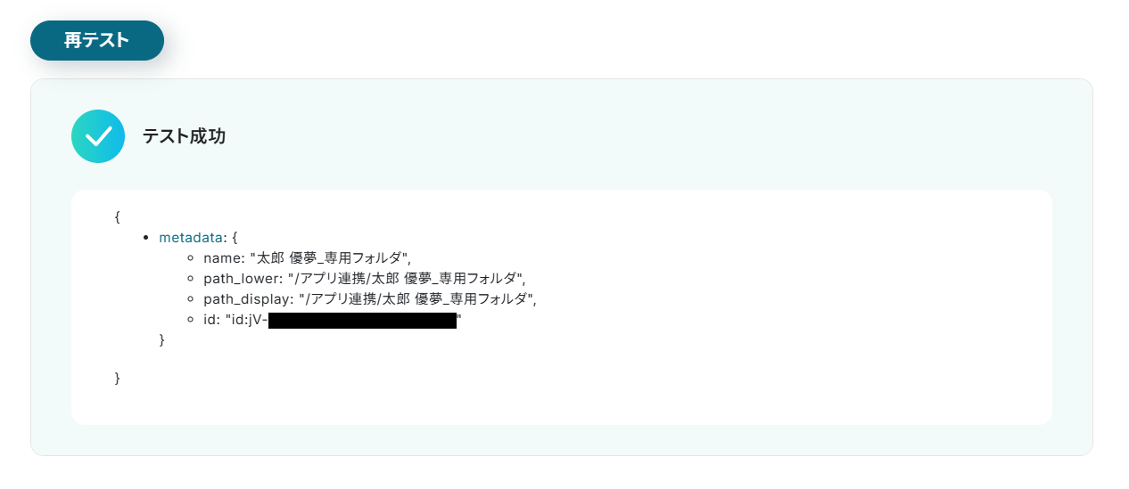 - 最後に、オペレーションでDropboxの「フォルダを作成する」アクションを設定し、購読者情報に基づいたフォルダを作成します。