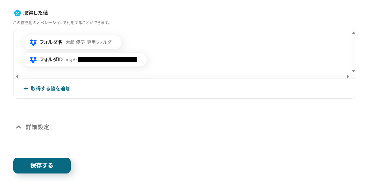 - 最後に、オペレーションでDropboxの「フォルダを作成」アクションを設定します