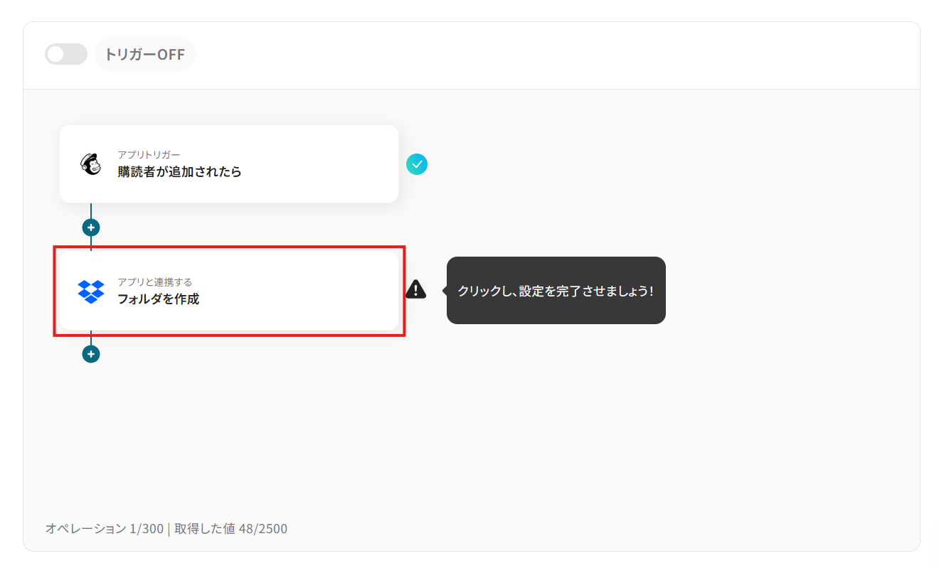 - Mailchimpのトリガー設定とDropboxに作成するフォルダの設定