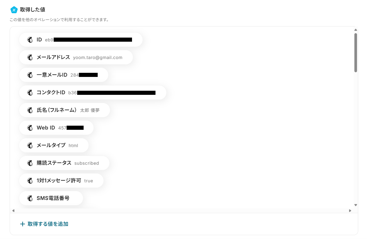 - テストに成功すると、「取得した値」に購読者情報が追加されます。