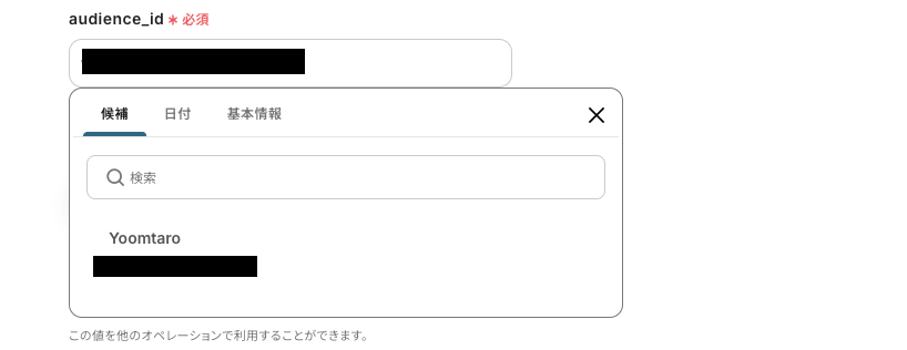 「audience_id」は、入力バーをクリックすると『候補』に連携したアカウントに基づいた情報が表示されます。
