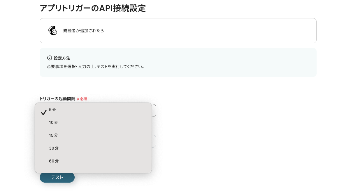 ・トリガーは5分、10分、15分、30分、60分の間隔で起動間隔を選択できます。