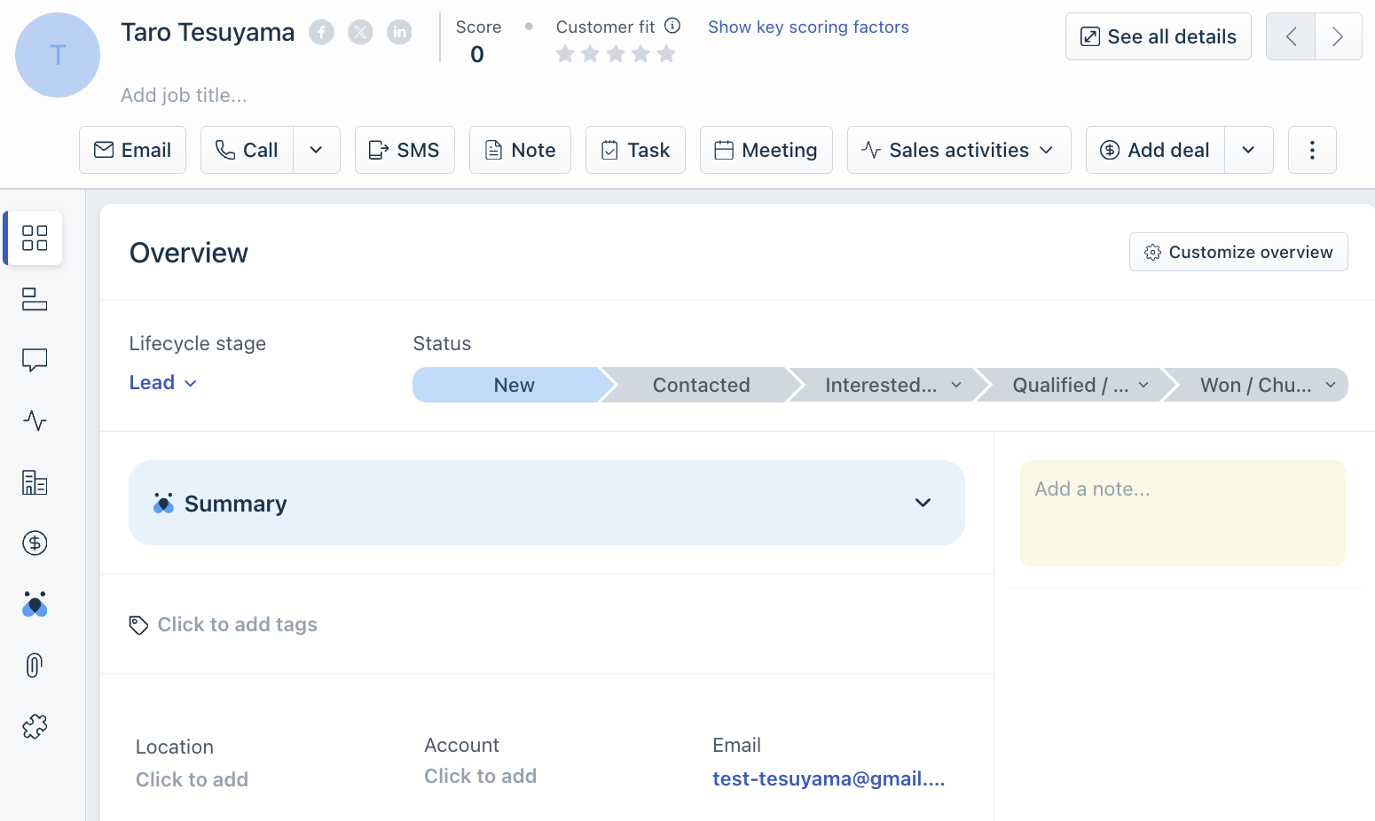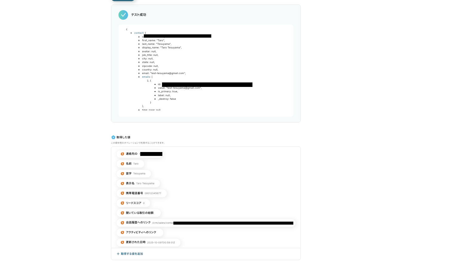 テストに成功すると、以下のように表示されて、実際にFreshsalesに情報が追加されます。