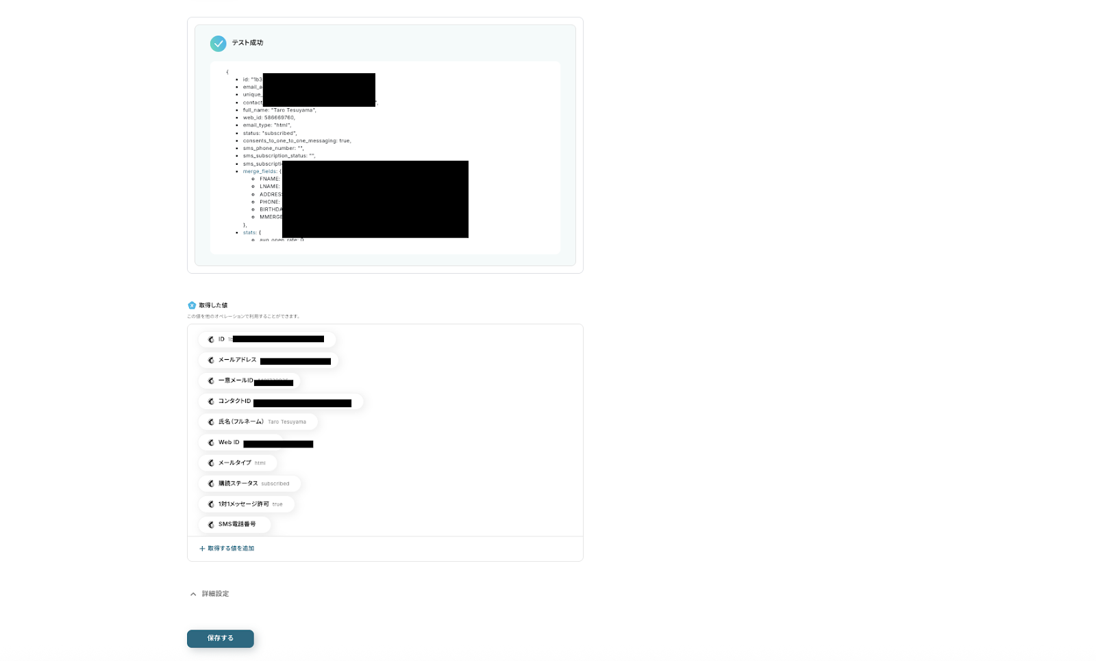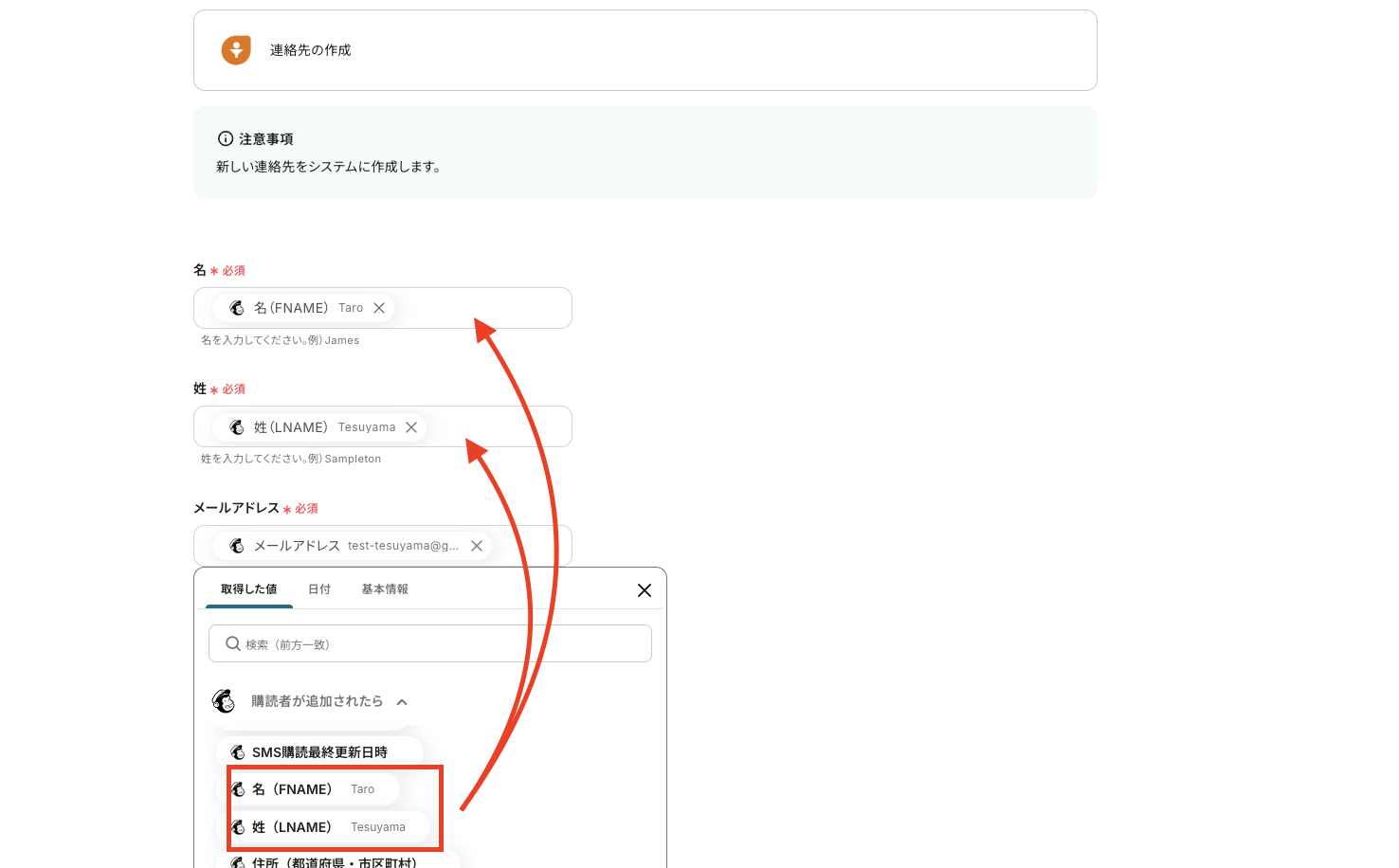 「姓」「名」を始めとする項目には、以下の画像のように、前ステップで取得した値を設定しましょう。