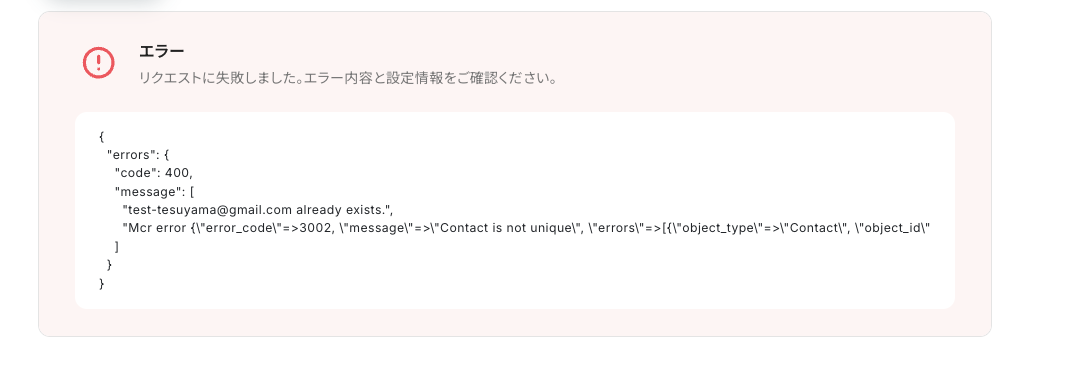 同じデータを登録しようとすると、以下のように重複エラーとなり、フローボットが停止します。
