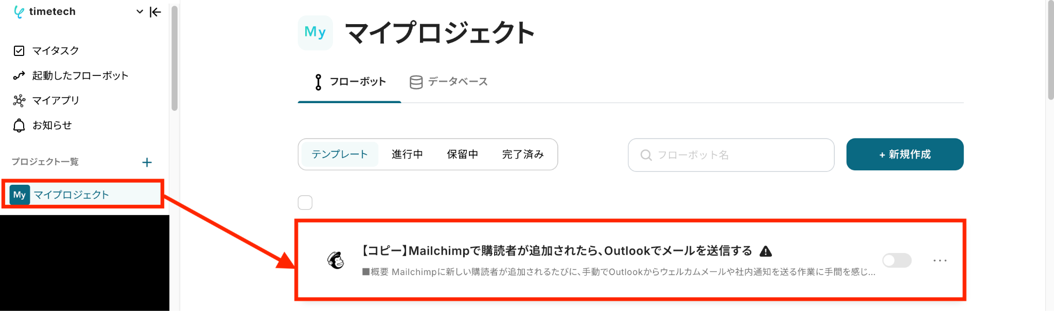 左側にあるメニューの「マイプロジェクト」から、コピーしたテンプレートを開きます。