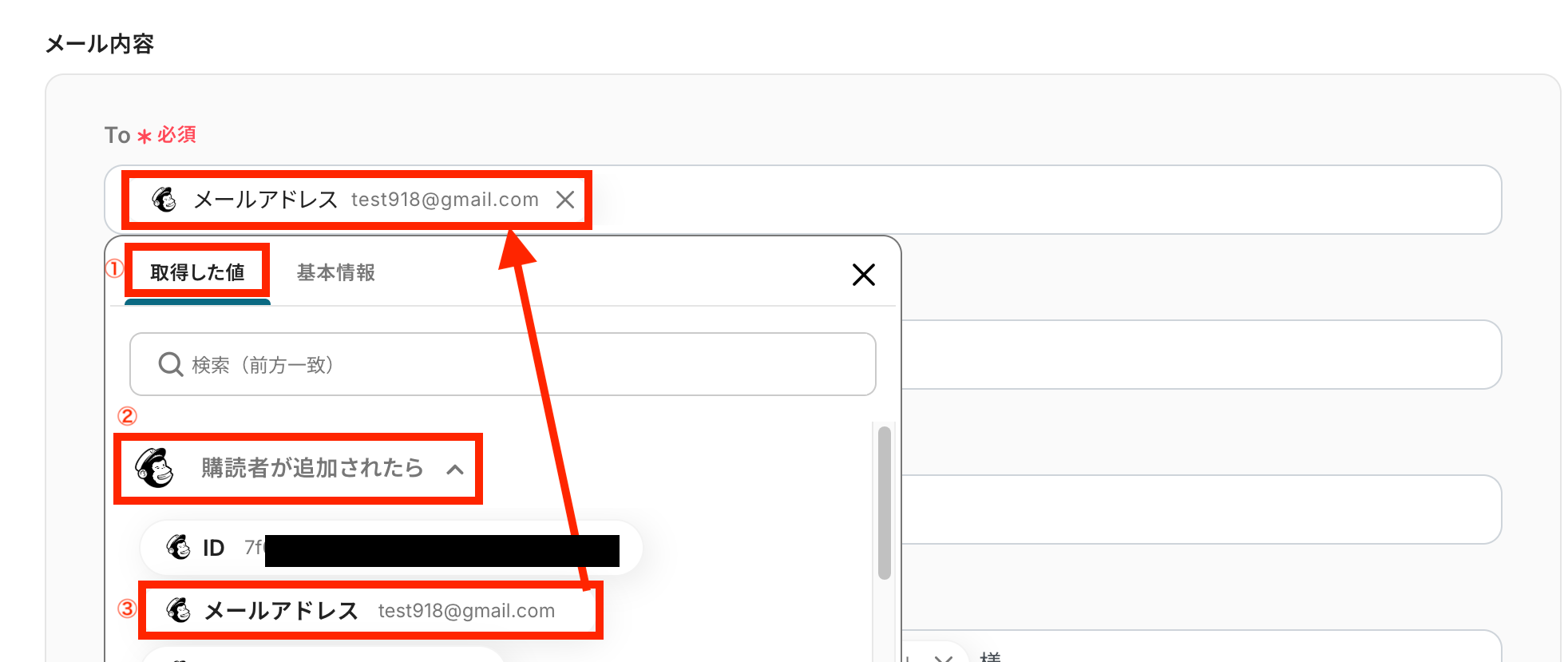 任意のアドレスを手入力で設定することもできますが、Mailchimpで追加した購読者へフォローアップメールを送信する場合は、ステップ3で取得した値を埋め込みます。