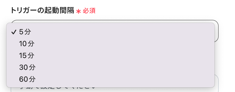 ・トリガーは5分、10分、15分、30分、60分の間隔で起動間隔を選択できます。