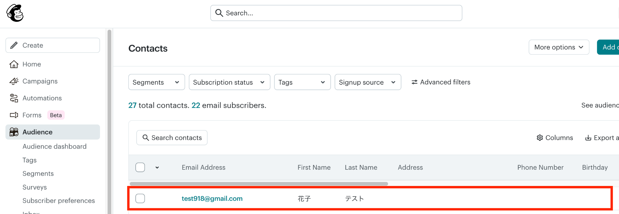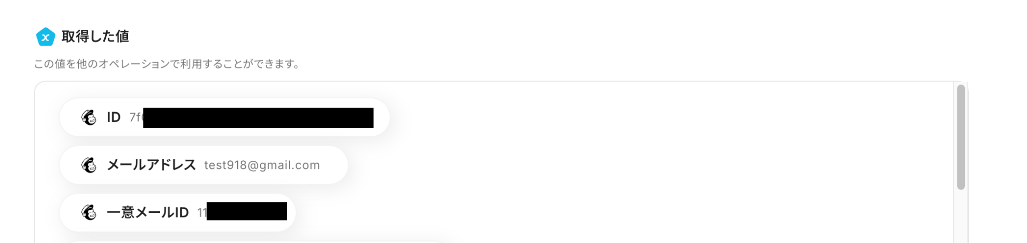テストに成功すると「取得した値」としてMailchimpに登録した購読者のデータがアウトプットされます。